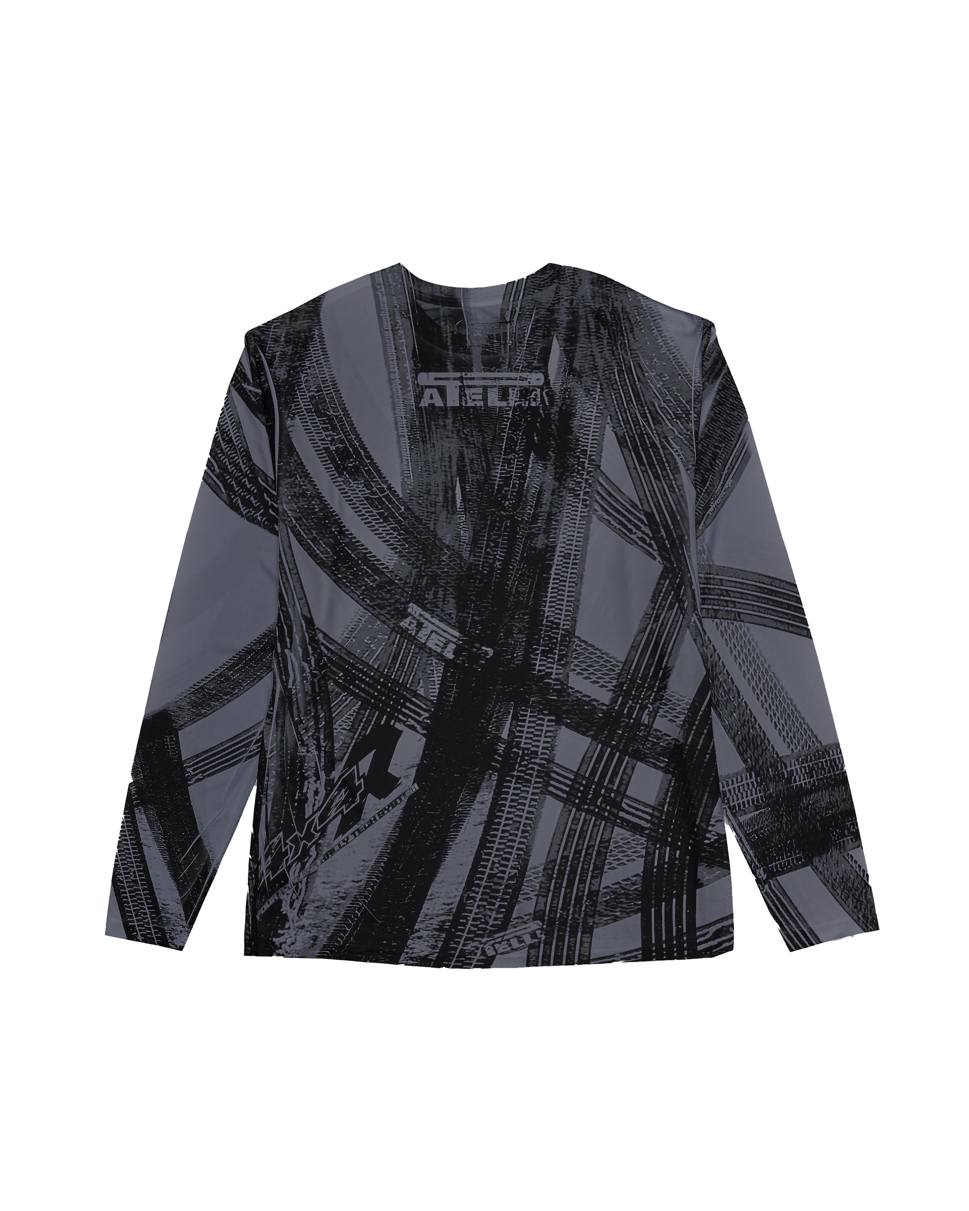 The Burnout Longsleeve is a lightweight polyester shirt decorated with an all-over sublimation print. To create a seamless pattern, prints were pressed directly onto the finished garments. This process allows room for distinctive imprints unique to each shirt.